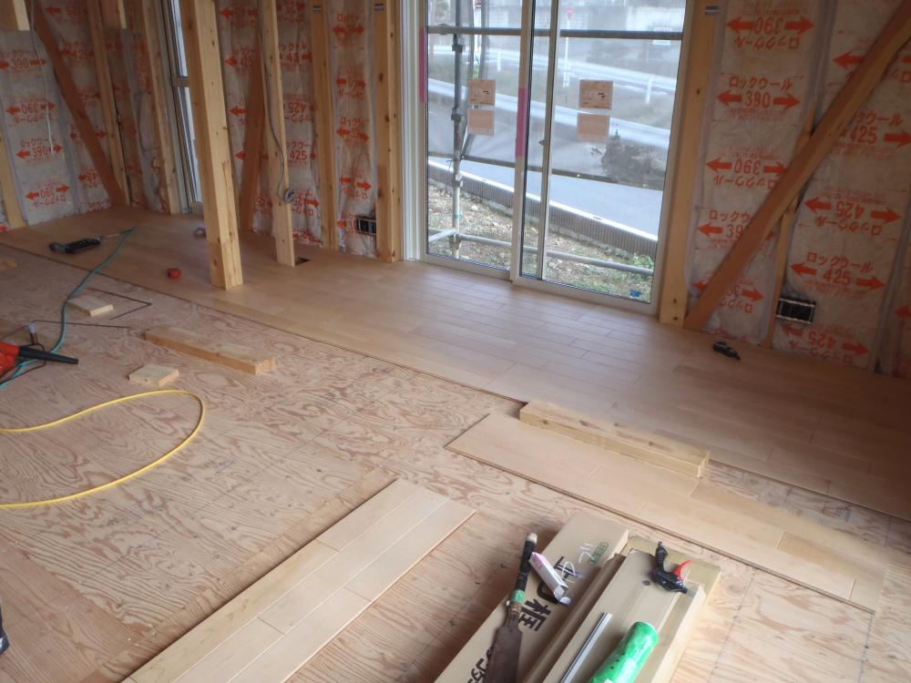 ・内部木工事、2階床フローリング貼りを階段廻り残して、