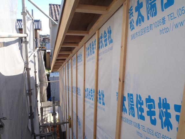 ・木工事、軒天下地を組み、内部天井下地組み及び天井ボード 貼り、断熱材入れと行っています。 内部電気配線・配管に 入ります。 換気扇類の外壁シート貫通部、防水処理後、保証機構JIO、 外装下地検査を受けます。