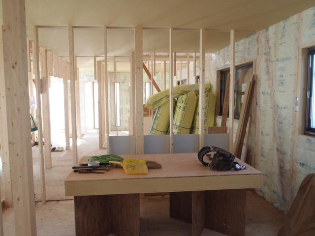 ☆先週の工事☆ 木工事(内部壁断熱材入れ、天井下地組み及び天井ボード 貼り、天井断熱材入れ、他) ☆今週の予定工事☆ 木工事(天井下地組み及び天井ボード貼り、軒天ボード貼り 窓枠取付、他) 内部電気配線・配管 保証機構JIO、外装下地検査