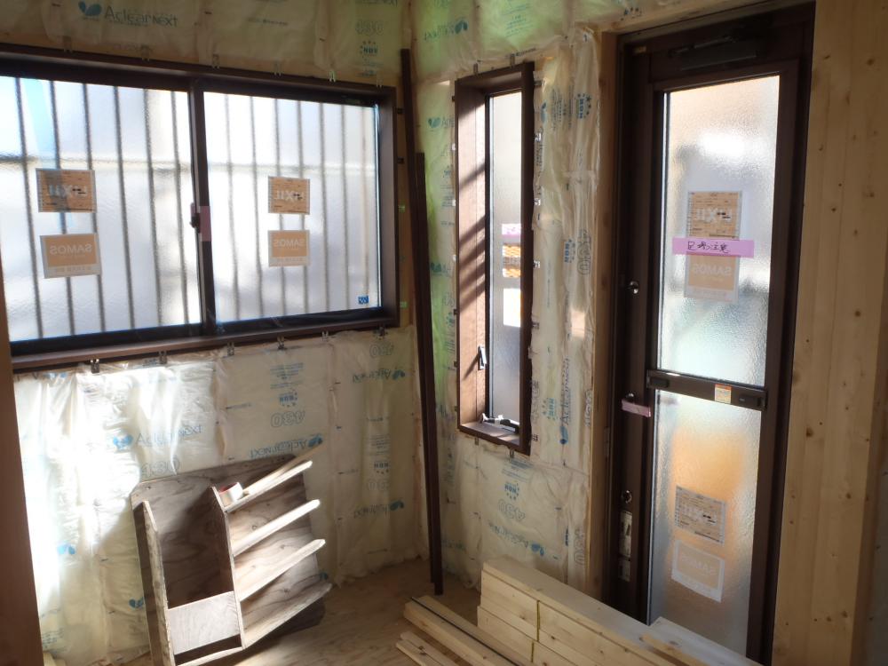 ・木工事、軒天ボード貼り、LDK天井下地組み及びボード貼り 窓枠取付を行い、床フローリング貼りに取り掛かりま した。 ・床フローリング貼りを貼り終えた部屋より床養生を敷き 壁ボード貼りへと予定しています。