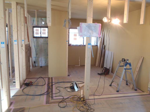 ・内部木工事、窓枠・ドア開口枠Yを開口枠を取付ながら、壁 ボード・壁下地合板貼りを進め、各部屋が間仕切られていき ます。来週、半ばより外壁サイディング搬入工事へと入っていき ます。