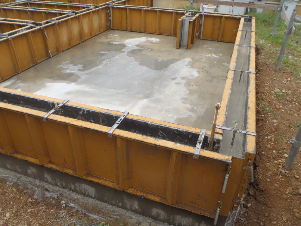 ・基礎工事、立ち上がり部コンクリートを打ち、型枠解体、玄関・ ポーチタイル及び浴室下地コンクリート打ちを進めています。 ・基礎廻り掘削部の埋め戻し基礎工事完了となり上棟に向け 構造材・下地木材搬入、土台据え、床下地組みと準備を 行います。