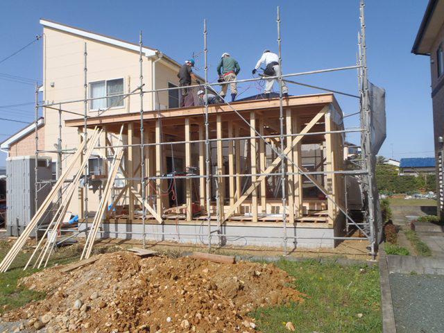 ☆先週の工事☆ 構造材・下地木材搬入、土台据え、床下地組み、上棟準備 足場組み 上棟 ☆今週の予定工事☆ 木工事(構造金物取付、1階床下地、外部造作、 窓開口造作、他)