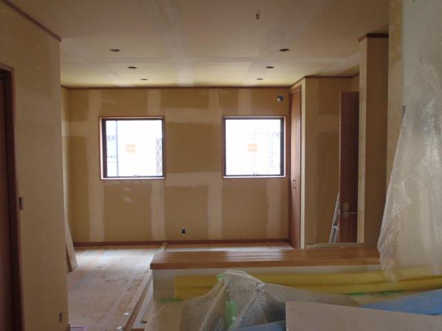 ・外部足場が解体され、建物外観がよく確認出来るようになり、 外部給排水埋設を進めていきます。 ・内装クロス下地、ボードジョイント部、ビス穴をパテ入れを行い クロス材が綺麗に貼れるよう処理を行っていきます。