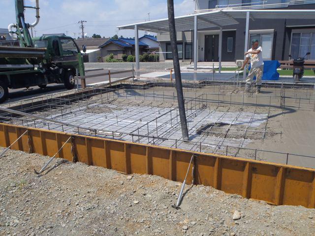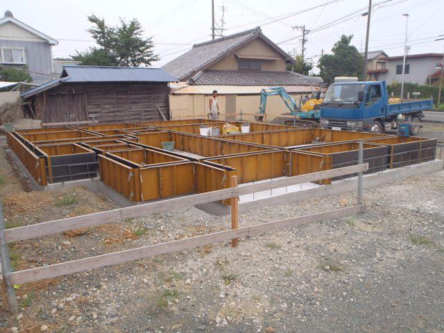 ・基礎工事、ベース型枠組み、鉄筋組みが完了し保証機構JIOに よる配筋検査(規定鉄筋組み、コンクリートと鉄筋の間隔などを 検査)を受けベースコンクリートを打ち終えました。基礎立上り部 型枠、アンカーボルト類設置し立上り部コンクリート打ちと進めていき ます。