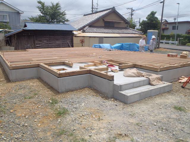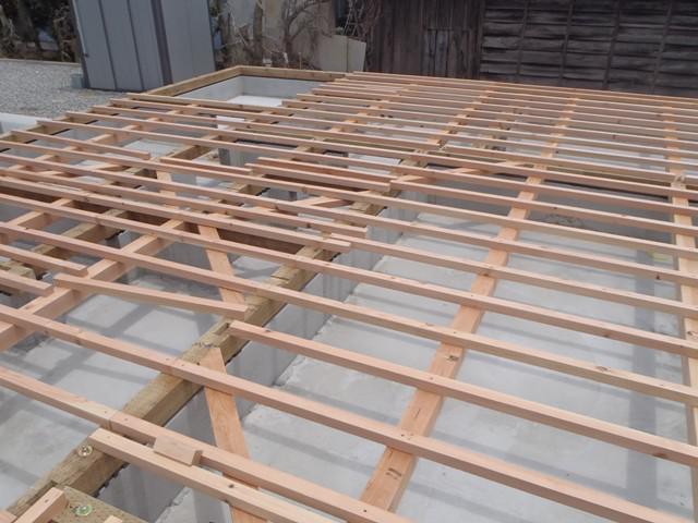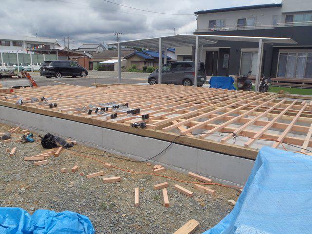 ・上棟に向け、土台据え・1階床下地組み、柱・梁材と構造材 下地木材が搬入され上棟を迎えます。 ・上棟当日は建物骨組み、屋根下地を予定していますので建物 高さ、部屋間取りを確認することが出来ます。