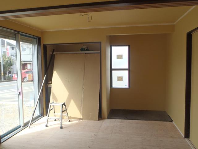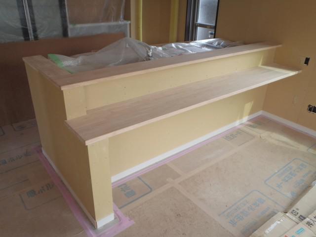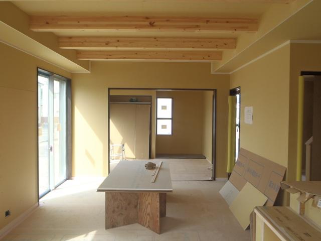・外部足場が解体され、建物外観がよく確認出来るようになり ました。外部給排水・エコキュート下地、浄化槽設置と外部工事を 進めていきます。 ・内部木工事、1階造作、幅木・廻し縁取付を終え,壁ボード 貼りと造作を進めています。