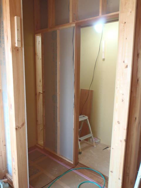 ・内部木工事、1階壁ボード・下地合板貼り、ドア開口枠