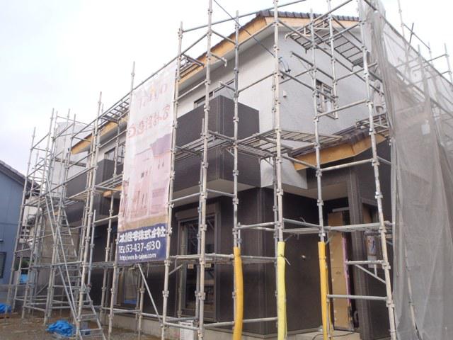 ・木工事、階段材取付、階段廻り壁納めと進み幅木・廻し縁 取付、棚類取付を行っていきます。 ・外部工事、TVアンテナ・換気フード類の器具付け、板金 樋掛けと進めていきます。 ・外部足場解体、外部給排水埋設を予定しています。