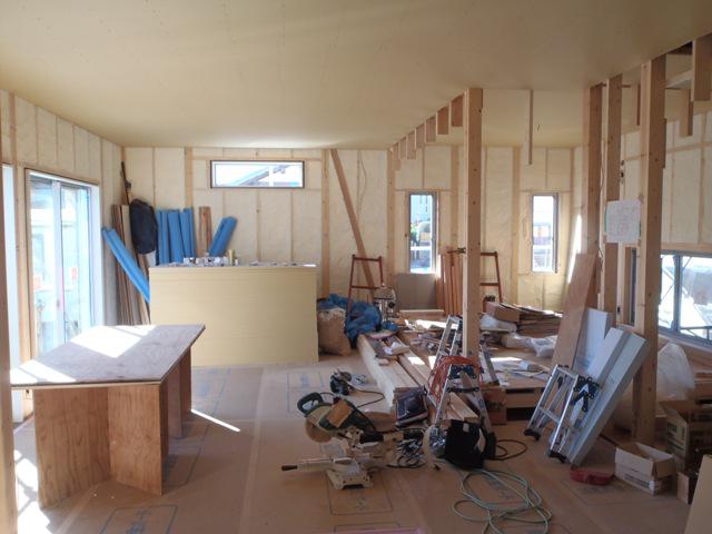 ・木工事、和室床下地組み、床フローリング貼りを終え、窓枠取付に 取り掛かりました。 ・窓枠を取付した壁よりプラスターボード及び下地合板貼りへと 入ります。 2日、ユニットバス据付完了しました。