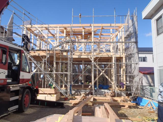 ☆先週の工事☆ 基礎工事(立上り型枠解体、埋め戻し整地、他) 構造材、下地木材搬入 上棟準備 上棟 先行足場組み ☆今週の予定工事☆ 屋根下地材葺き 木工事(筋カイ入れ、構造金物取付)