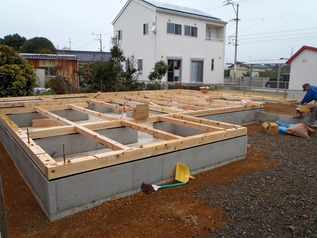 ・基礎工事、立上り部の型枠解体、基礎廻り埋め戻し整地、 玄関・ポーチタイルコンクリートを打ち終え、基礎工事完了しました。 ・上棟に向け、土台据え、床下地組み、構造材下地木材搬入と 上棟準備を進めいよいよ上棟を迎えます。 当日は、柱・梁組みと骨組みを組立て、屋根下地まで行い 建物高さ、間取り間隔が確認出来ます。