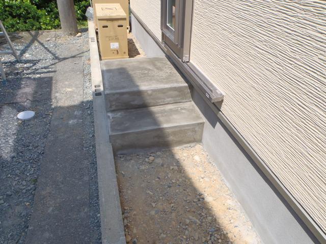 ・外部工事、勝手口階段、基礎幅木モルタル塗りを終え、 浄化槽設置、エコキュート据付、玄関・ポーチタイル工事へと 進めていきます。 ・内部木工事、2階から小屋裏の階段造作を終え、廻し縁・ 幅木、棚類取付を行っています。