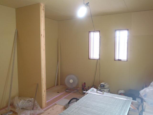2階窓枠取付、壁プラスターボード壁下地合板貼りを進め、各部屋