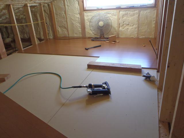 ・外部木部、軒天塗装を終え板金工事(破風鼻隠し)樋掛けを 行っています。台風18号進行状況が心配ですが外部足場 シートをたたみ資材養生、準備をしました。 ・内部木工事、2階間仕切り壁を進め、小屋裏、床フローリング、 天井・壁ボード貼りに取り掛かりました。