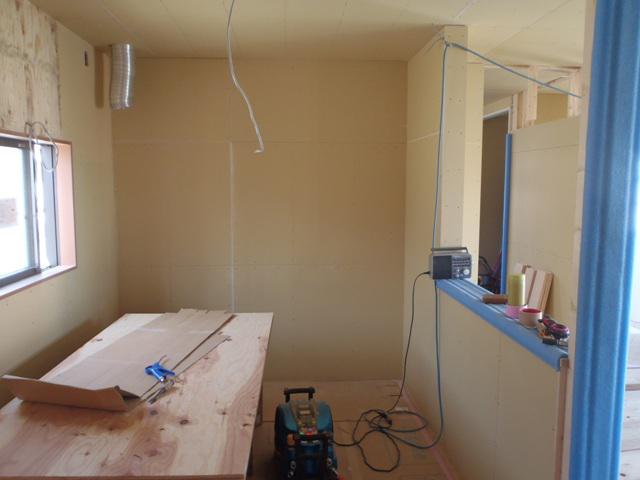 開口枠取付、壁プラスターボード貼りが進み部屋が間仕切ら