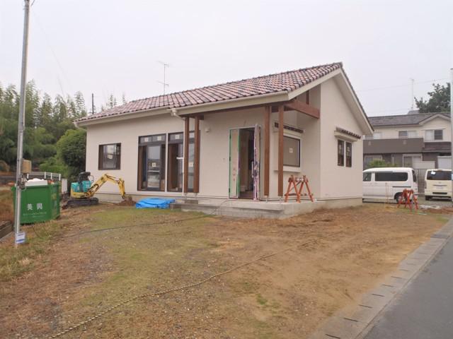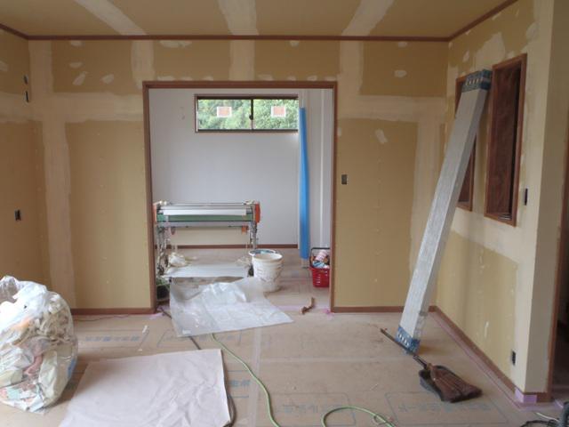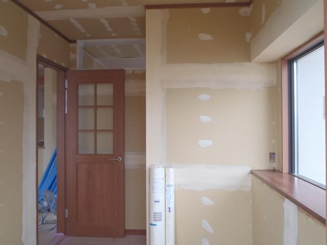 ・外部足場が解体され、建物外観がよく確認できます。外部 雨水・給排水配管、給水接続電力幹線埋設と外部仕上げを 進めています。 ・内部クロス工事、下地パテ入れプラスターボードジョイント部、ビス 穴埋めと下地調整し、天井・壁とクロス材を貼り進めています。