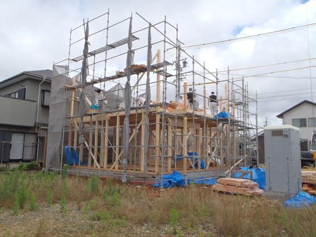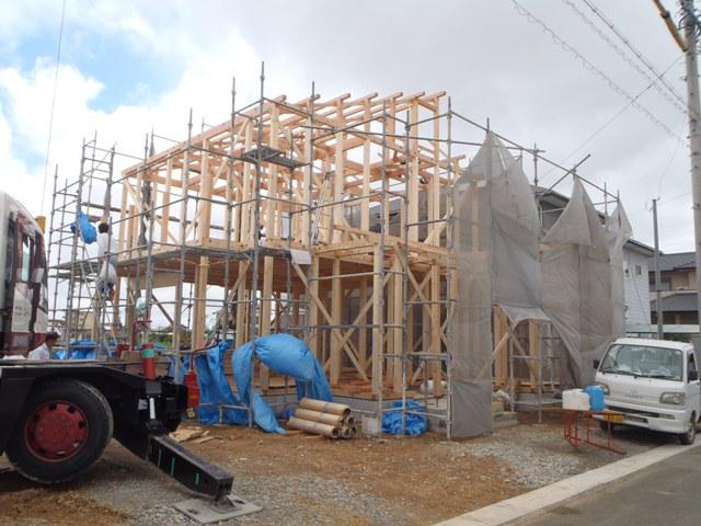 ☆先週の工事☆ 基礎工事(玄関・ポーチタイル下地、埋め戻し整地、他) 構造材・下地木材搬入 上棟準備 足場組み 上棟 ☆今週の予定工事☆ 木工事(筋かい・間柱入れ、構造金物取付、ベランダ下地、他)
