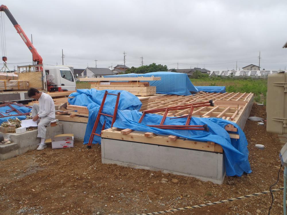 ・基礎工事、玄関・ポーチタイルコンクリート打ちを終え、基礎工事完了 となり、上棟準備・土台据え・床下地組み、構造材・下地 木材搬入し建て方・上棟並びに屋根下地まで進め、朝方の雨 で天候が心配でしたが無事に作業を終えることができました。