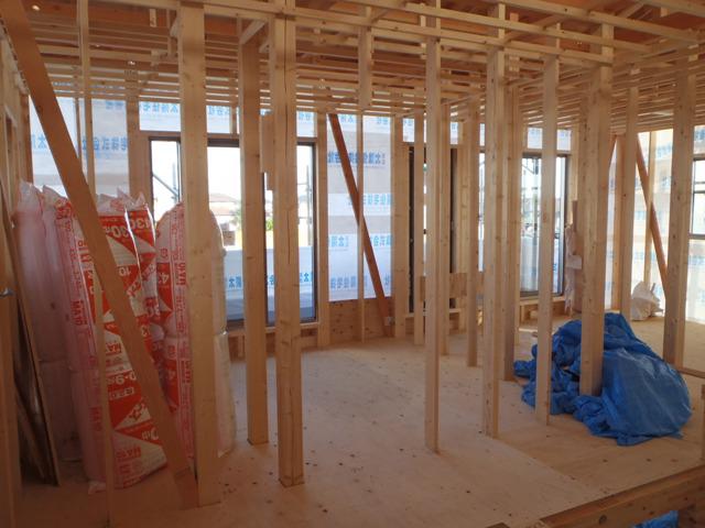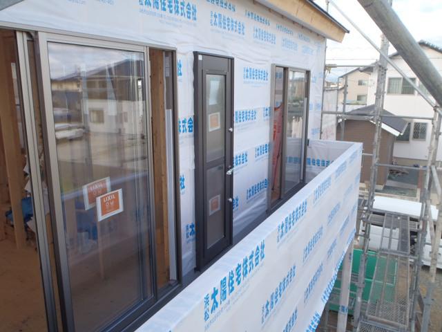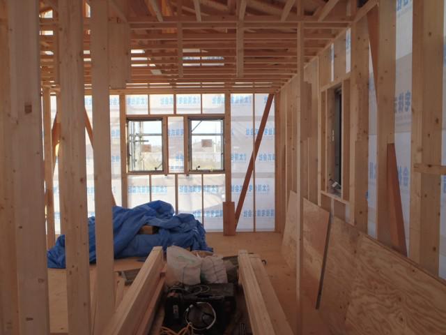 木工事(窓サッシ取付、1階床断熱材入れ、下地合板本締め、