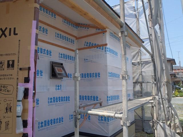 ・木工事、1階天井ボード貼り、外装下地検査を受け、外壁 下地材打ち、1階床フローリング貼り、ドア開口枠組み立てと 内外部造作を進めています。 ・3日、ユニットバス据え付けを行いました。
