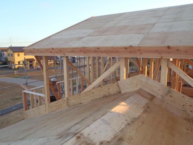 ・上棟おめでとうございます。台風12号の影響が心配でしたが 柱・梁の構造材組み、屋根小屋組みを行いました。下屋下地 合板張り、建物の耐力壁となる筋カイ及び間柱入れ、構造材 金物取付を行っています。
