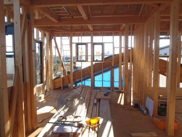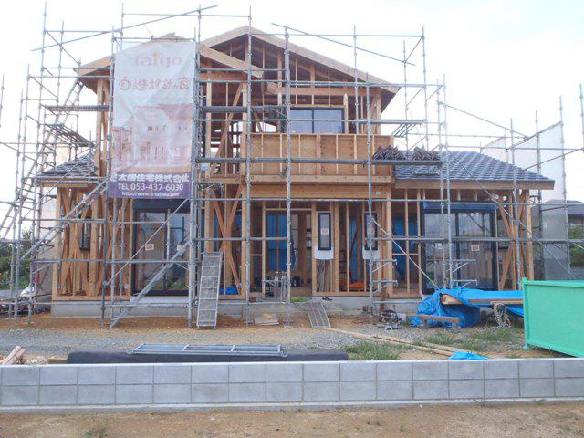 1階床断熱材入れ、床下地合板、他) 外壁下地シート貼り