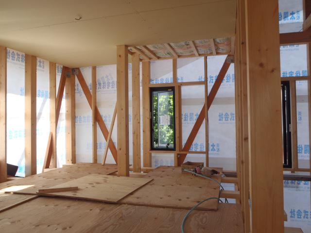 天候が崩れ、内部造作、2階天井下地、天井断熱材入れ及び