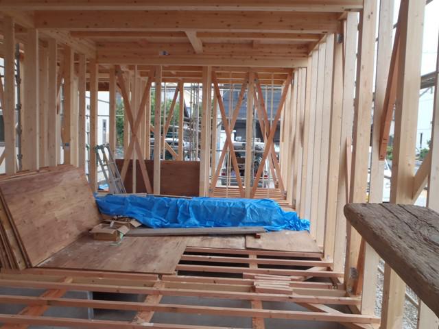 ☆先週の工事☆ 上棟 木工事(筋かい・間柱入れ、構造金物取付、ベランダ 下地、他) 屋根下地ルーフィング葺き ☆今週の予定工事☆ 木工事(ベランダ下地、窓サッシ造作、軒天下地組み、他)