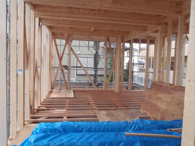 ・上棟おめでとうございます。柱・梁の構造材組み、屋根小屋 組み、屋根下地板貼りまで行うことができました。 ・建物の耐力壁となる筋かい及び間柱入れ、構造金物取付を行 っています。ベランダ下地、FRP防水、窓サッシ開口造作を 進めています。