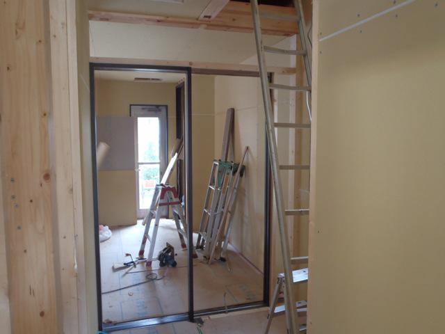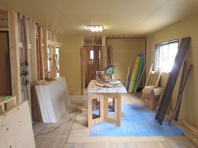 ・内部木工事1階ドア開口枠取付を取付ながら壁下地合板及び プラスターボード貼りが進んでいます。 ・2階同様、各部屋が間仕切られていきます。