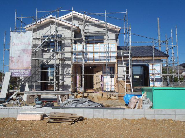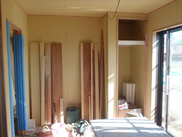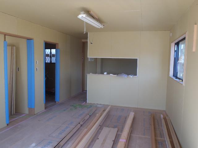 ・外壁サイディング貼り、ポイントサイディングを残し建物9割程貼り終えました、窓周り・軒天取り合い部コーキング打ちにも取り掛かります。 内部木工事、ドア開口枠取付、壁下地ボード貼りを終え、幅木・回し縁取付進めています、階段造作・建具吊り込みを行えば木工事完了となり、内装仕上げ工事へと入ります。