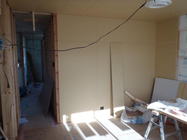 材を張り進めています。内部木工事、壁下地合板貼り、窓枠・