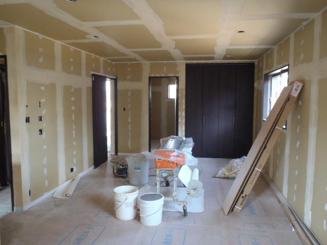 ・外部工事、軒天塗装を終え、板金・樋掛けを進めています、 換気扇フード・TVアンテナ取付を終えましたら外部足場解体予定 しています。 ・内部仕上げ工事、クロス下地・パテ入れを ビス頭・ボードジョイント部に 入れクロス材が綺麗に張れる様下地処理進めています。