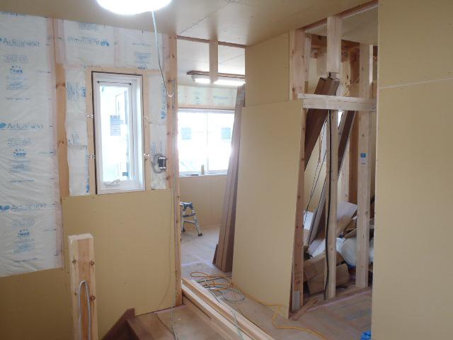 窓枠取付ながら壁下地・ボード貼りを進めています、階段造作