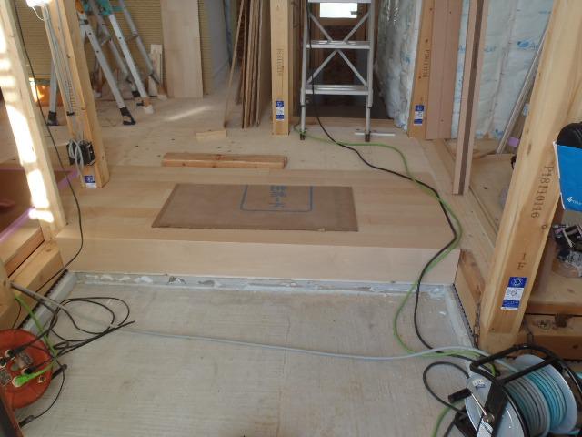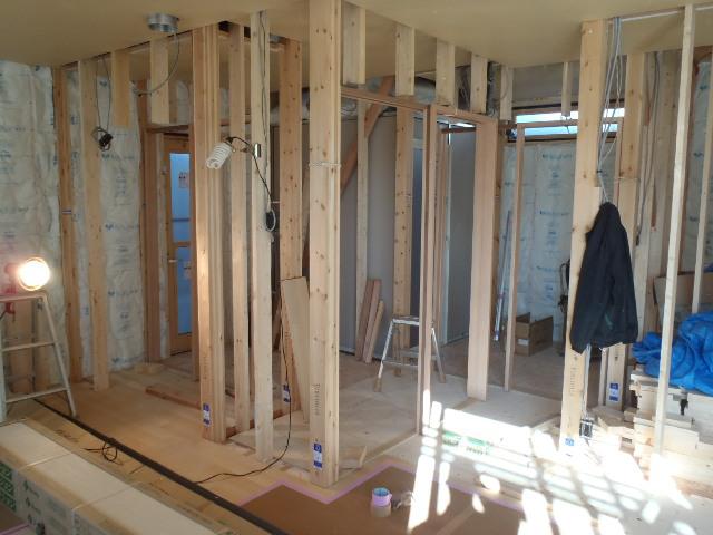 ・木工事、外壁下地材を打ち終え、壁断熱材入れ、床フローリング 貼りを進めています。 ・床貼り完了しましたら、壁ボード・下地合板貼り、ドア開口枠取付 と内部造作を進めます。