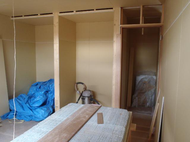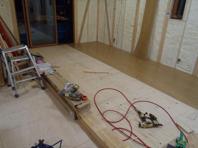 ・内部木工事 2階床フローリング貼りを行いながら、ドア開口枠 取付、床養生敷き込みと壁下地ボード貼りを行い1階LDK 天井下地組み及び天井ボード貼り、床フローリング貼りに入り ました。 25日ユニットバス据付を行います。