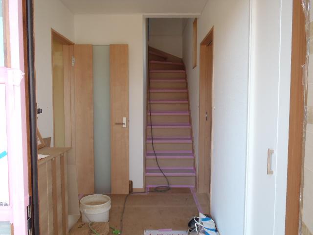 ・内部木工事、幅木・回し縁取付、建具吊込を行い完了と