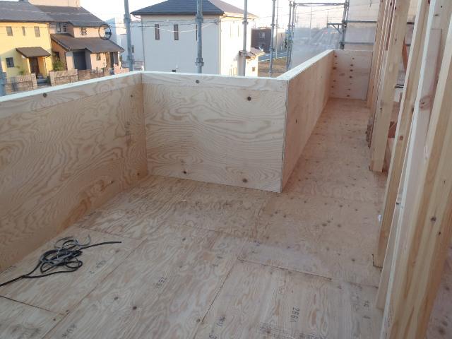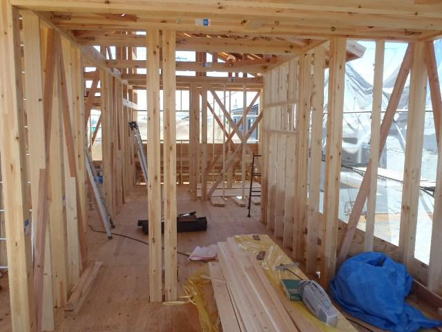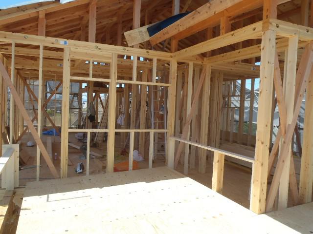 ☆先週の工事☆ 木工事(2階筋カイ・間柱入れ、窓開口、ベランダ下地、 下屋下地、他) ☆今週の予定工事☆ 木工事(1階筋カイ・窓開口、構造金物取付、他) 屋根工事(下屋ルーフィング敷き、瓦荷揚げ、 瓦桟打ち、瓦葺き)