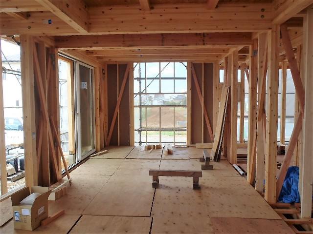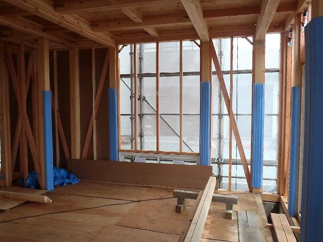 ・屋根瓦工事、平板瓦葺きを終え役物瓦、棟瓦葺きに取り掛か りました。 ・木工事、構造金物・構造面材1階窓サッシ取付、2階窓開口造作 及びサッシ取付と進めています。ベランダ下地、壁下地(屋根下 矢切部)間柱入れと予定しています。