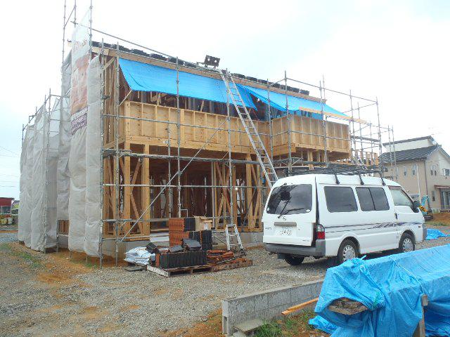 ☆先週の工事☆ 木工事(構造面材取付、窓サッシ取付、ベランダ下地、他) 屋根工事(瓦葺き、役物瓦葺き、棟瓦葺き、他) ☆今週の予定工事☆ 木工事(窓サッシ取付、ベランダFRP防水、屋根矢切壁 下地・間柱入れ、他) 屋根工事(瓦葺き残り、下屋根 GL鋼板葺き)