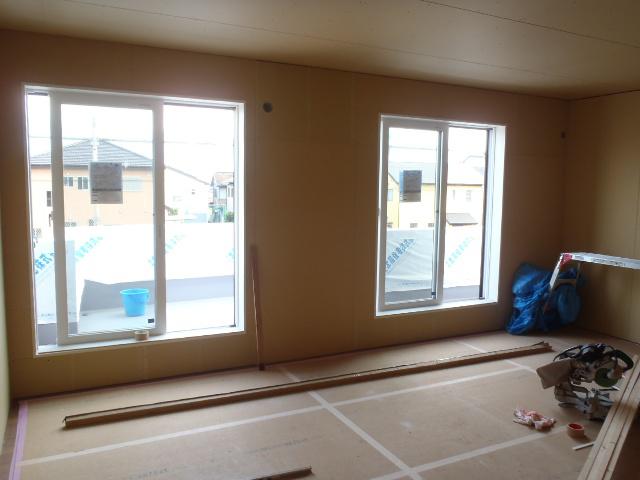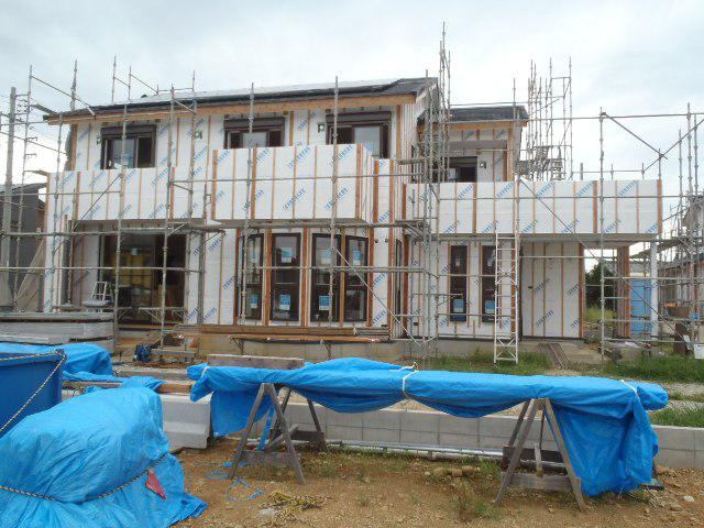 ・内部木工事、壁ボード貼りが進んでいます、開口枠取付及び