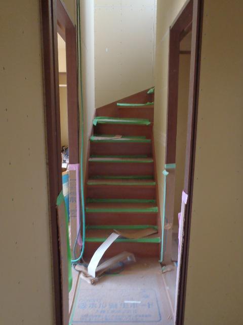 ・木工事、2階壁ボード貼りを終え、回し縁・幅木取付、階段造作 が完了し2階へ上がりやすくなりました、1階階段下トイレ、和室 造作を進めて行きます。