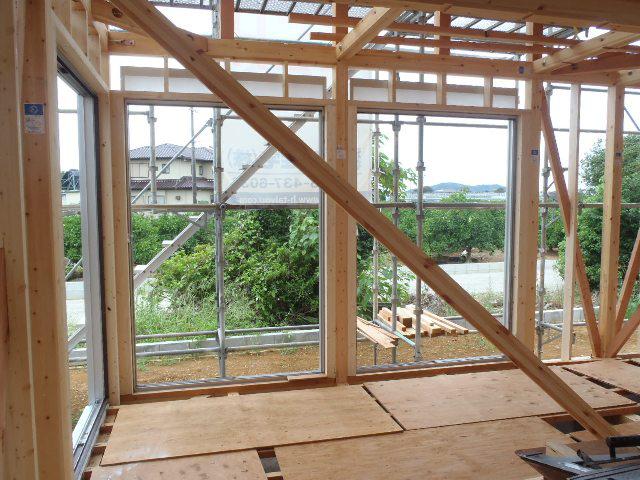 木工事、窓サッシ開口造作しサッシ取付、本筋カイ・間柱入れ、構造