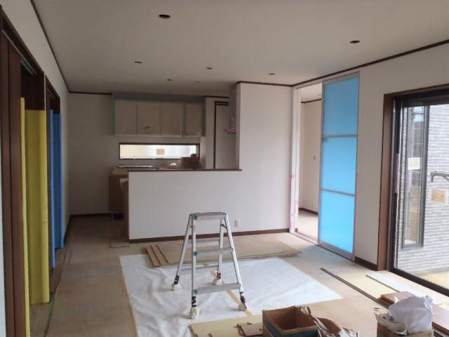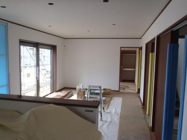 ・外壁サイディング貼りが完了しました、コーキング打ちを進めて います、コーキング材乾き次第軒天塗装、板金工事に入ります。 ・内部工事、電気スイッチ・コンセント類プレート取付、換気扇等器具付け進め ています。