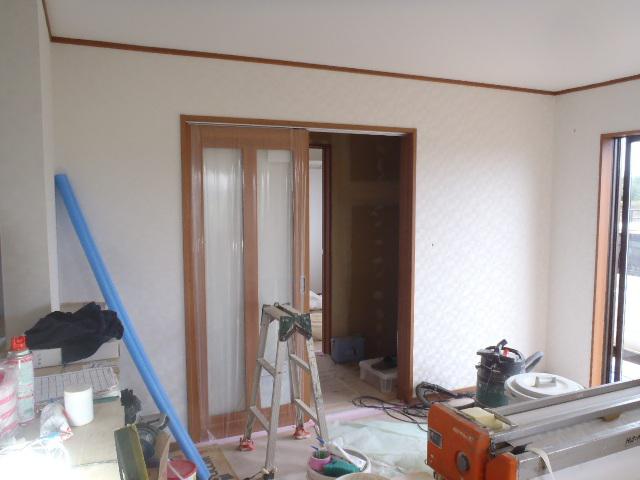 ・内装仕上げ工事、クロス下地、クロスパテを終えクロス張りを進めて