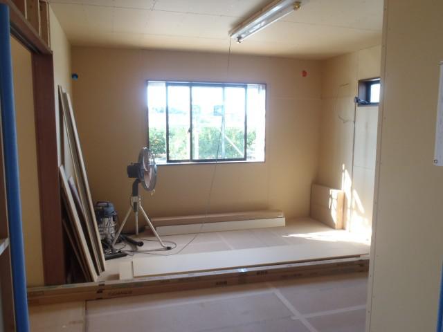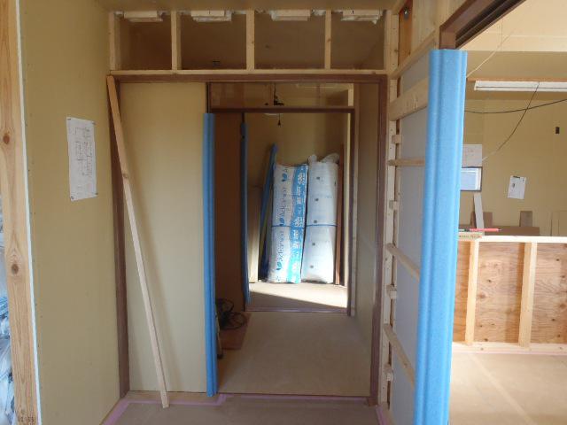 ・内部木工事、ドア開口枠取付が進み開口周り壁材納めて