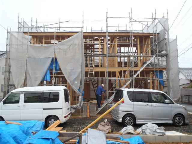 1階床断熱材入れ、外壁シート貼り、他)