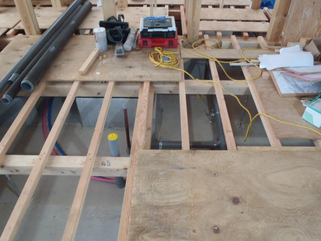 1階床断熱材入れ、外壁シート貼り、他) 内部給排水配管