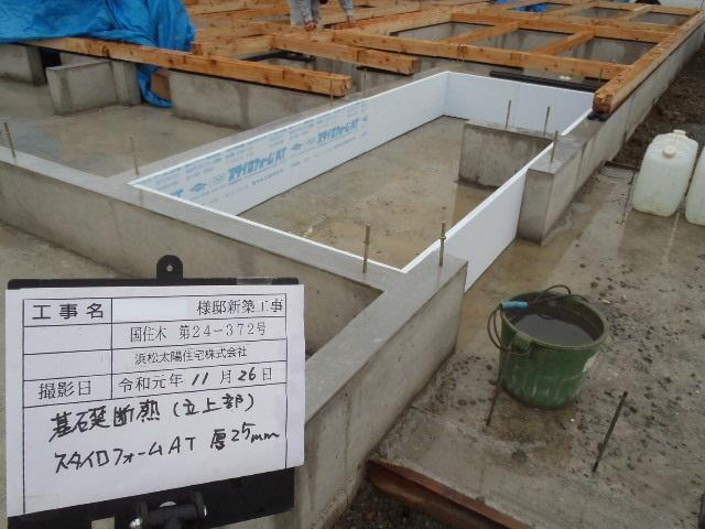 ・基礎工事、立上り部の型枠解体、基礎廻り埋め戻し整地、 玄関・ポーチタイルコンクリートを打ち終え基礎工事完了となります。 上棟に向け、土台据え、床下地組み、構造材下地木材搬入と 上棟準備を進め いよいよ上棟を迎えます、当日は柱・梁材 を組み屋根下地と行い、建物高さ間取り間隔等確認できます。